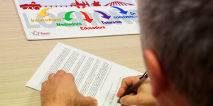 Tras la presentación del II Plan de Convivencia Intercultural a la Asociación Rioja Acoge, su Presidenta firmó la adhesión al Compromiso por la Convivencia Intercultural del Ayuntamiento de Logroño.